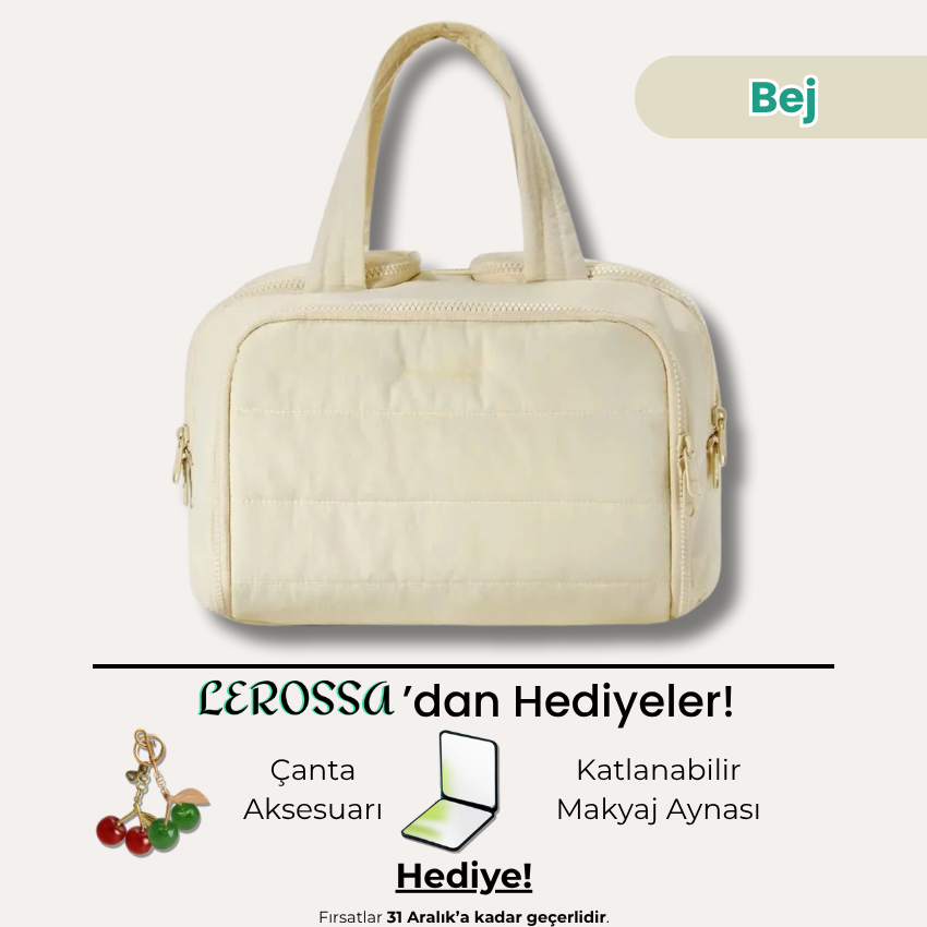 LEROSSA makyaj çantası, çok bölmeli yapısı, su geçirmez iç yüzeyi ve zarif tasarımıyla hem şık hem kullanışlı bir çözüm sunar.